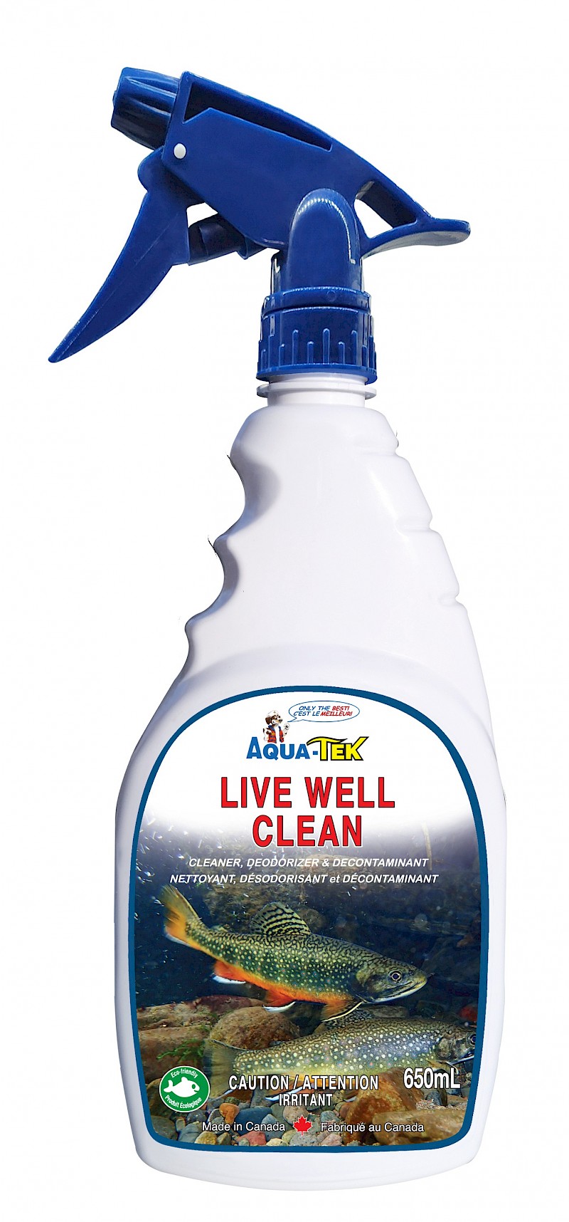 A one-step cleaner, deodorizer and decontaminant for live wells, bait wells, coolers, bait buckets, refrigerators, freezers, boat hulls, trailers, lower units, anchors, fishing gear, diving gear and ropes. The environmentally friendly formula removes fish waste, fish blood, biofilm, organics, algae, mould & mildew stains and hard water deposits while neutralizing fishy odours, decaying fish, mud, earthy and organic odours. Can be sprayed on surfaces or run through the live well system. Will not harm painted surfaces, fiberglass, plastics, stainless steel and aluminum.