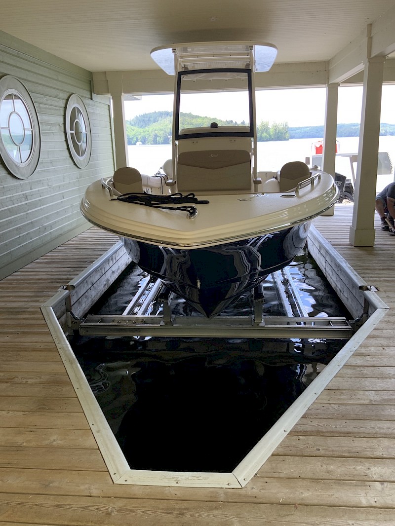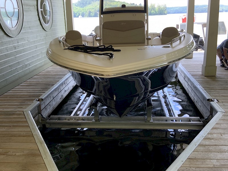 This new lift provides an innovative design to the traditional wetslip lift and the standard hidden lift. The entire lift assembly mounts directly to the side of the boat slip . It can be incorporated into newly constructed boat houses , boat ports or U shaped permanent docks . It eliminates the need for overhead I beams and cables that hang from the ceiling . The entire hydraulic mechanism is contained within the bed assembly with no parts of the lift in the water when it is in the up position. The remote controls allow you to control the raising and lowering of your boat while still in it . The lift assembly is available with 220 volt power or solar power. They are available in 6000 lb. or 10,000 lb. capacity.