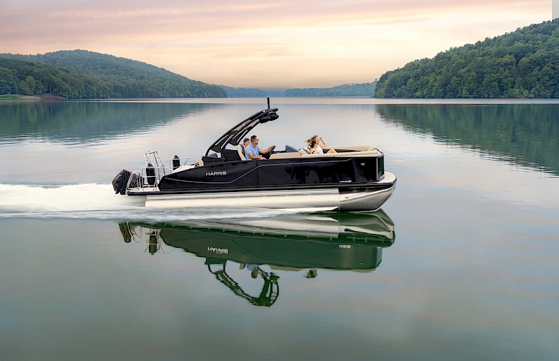 The 2026 Sunliner marks a bold evolution in Harris design, engineered from the inside out to elevate the onboard experience. At the bow, DualView loungers allow riders to face forward or comfortably face back toward their friends and family. Behind the seatbacks, magnetic latches make storage access seamless. A large trash bin sits in the starboard with space for an anchor or second bin on the port. The chaise back has been reconfigured for extra flexibility. Every Sunliner includes thoughtful touches like a shoe nook, lockable compartment for valuables, and options for a flip-up table or cooler drawer. Comfort and style stand out with the Luxe package, featuring enhanced foam density and premium stitching for a curated look and feel. New layouts, such as the SLE create a dedicated space for dining and socializing without sacrificing the rear sun lounger. Multi-position backrest on multiple layouts, and a remarkable helm space with easy access to electronics and an ergonomic design make it a comfortable driving experience. Popular options include a see-through bow gate for improved docking visibility, a folding tower comes standard on the Sunliner Sport, and an optional inflator/deflator for inflatables makes entertaining easier. Exterior styling draws inspiration from Harris’ premium models, minimizing bars for a cleaner aesthetic and introducing a squared bow shape that complements the redesigned furniture and gives a distinct look on the water.