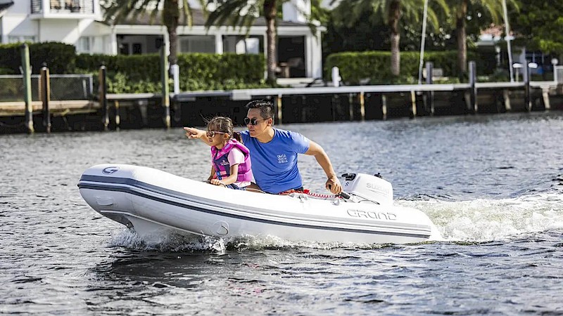 Compact and capable. The GRAND Silverline S275 is a 9 ft rigid hull inflatable dinghy, rated for 10HP engine max, 3 persons, and weighs 53kg/117lbs. Your classic, low-maintenance and reliable sailboat tender or small day boat to explore the world—take it out for lunch on the beach or perhaps a short trip to the mainland for supplies. Its streamlined design, durable build, and easy handling make it ideal for beginners or those looking for a stripped-back, no-fuss craft.